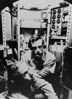 The Trieste out of waterThe two men periodically reported their progress via a sonar-based phone handset, however there was little to report aside from the rapidly rising readings on the pressure gauges and the falling readings on the thermometers. The warmth inside the uninsulated sphere steadily dwindled.Partway into their long descent, Walsh and Piccard grew alarmed when they discovered they were no longer able to raise the mother ship on the sonar/hydrophone communication system, even after repeated attempts. The two men were thus left truly isolated from the outside world. Curled up in the cramped, cold, and dimly-lit sphere, the adventurers continued their hours-long downward journey with only one another’s voices and the occasional pop or groan from the Trieste’s strained hull to punctuate the anxious silence.