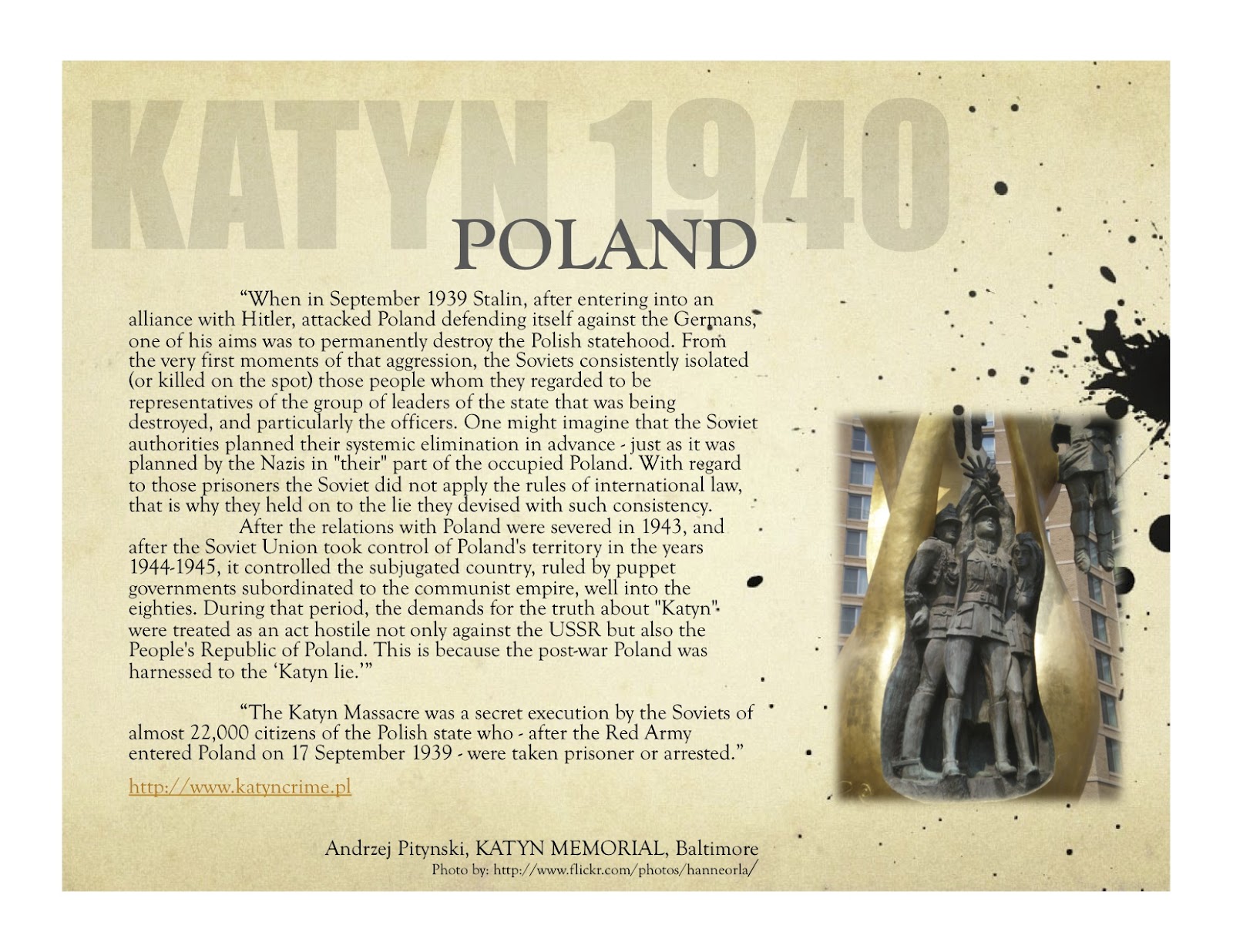 In 1939, Poland had been invaded from the west by Nazi forces and from the east by Soviet troops. Sometime in the spring of 1940, thousands of Polish military officers were rounded up by Soviet secret police forces, taken to the Katyn Forest outside of Smolensk, massacred, and buried in a mass grave. In 1941, Germany attacked the Soviet Union and pushed into the Polish territory once held by the Russians.