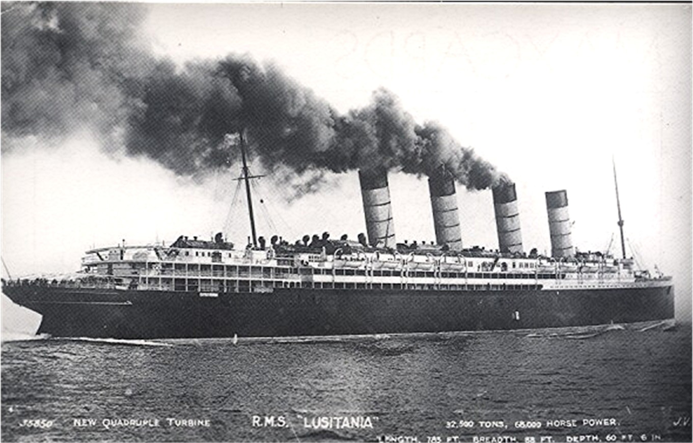 In early May 1915, several New York newspapers published a warning by the German embassy in Washington that Americans traveling on British or Allied ships in war zones did so at their own risk. The announcement was placed on the same page as an advertisement for the imminent sailing of the British-owned Lusitania ocean liner from New York to Liverpool. On May 7, the Lusitania was torpedoed without warning by a German submarine just off the coast of Ireland. Of the nearly 2,000 passengers, 1,201 were killed, including 128 Americans.