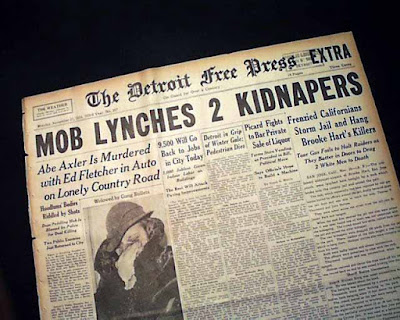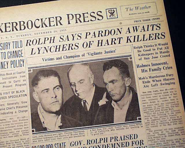 Thousands of peoples in San Jose, California, storm the jail where Thomas Thurmond and John Holmes are being held as suspects in the kidnapping and murder of Brooke Hart, the 22-year-old son of a local storeowner. The mob of angry citizens proceeded to lynch the accused men and then pose them for pictures.