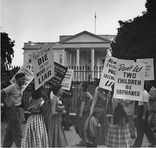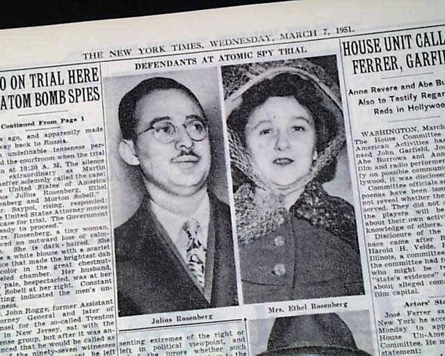The trial of Ethel and Julius Rosenberg begins in New York Southern District federal court. Judge Irving R. Kaufman presides over the espionage prosecution of the couple accused of selling nuclear secrets to the Russians (treason could not be charged because the United States was not at war with the Soviet Union). The Rosenbergs, and co-defendant, Morton Sobell, were defended by the father and son team of Emanuel and Alexander Bloch. The prosecution includes the infamous Roy Cohn, best known for his association with Senator Joseph McCarthy.