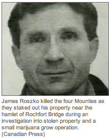 James Roszko (October 8, 1958–March 3, 2005) was a Canadian man who at the time of the shootings was operating a hydroponic marijuana grow-op outside of Mayerthorpe, Alberta. According to documents obtained by the CBC's the fifth estate in a court case to have the search warrants made public, police seized seven growing marijuana plants, and 88 harvested plants from the residence, plus a further 192 growing marijuana plants along with growing equipment from the quonset. Roszko was also suspected of various property crimes, which were the main thrust of the investigation prior to the shooting. He had a history of violent and sexual offences. He was prohibited from legally possessing firearms at the time of the tragedy.