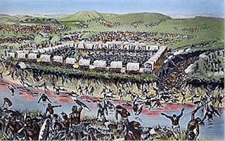 On 16 December, dawn broke on a clear day, revealing that "'all of Zululand sat there'", said one Trekker eyewitness.[6] But General Ndlela and his crack troops, the Black and White Shields, remained on the other side of the river, observing Dambuza's men at the laager from a safe position across the hippo pool. According to the South African Department of Art and Culture: