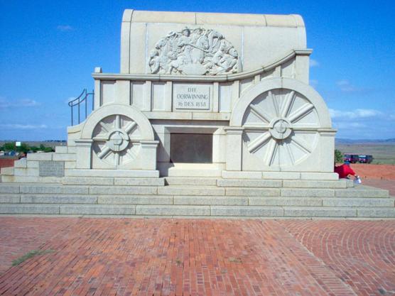 A church, called the Church of the Vow, was built in the Natal town of Pietermaritzburg in 1841, where Pretorius settled on the farm Welverdient (English: Rightly Earned), a gift from the Trekkers.[20]A monument was erected on the site of the battle in 1947, consisting of an ox wagon executed in granite by the sculptor Coert Steynberg. In 1971 a laager of 64 ox wagons cast in bronze( by Unifront Foundry in Edenvale- Fanie de Klerk and Jack Cowlard) was erected, and unveiled on 16 December 1998.[21]