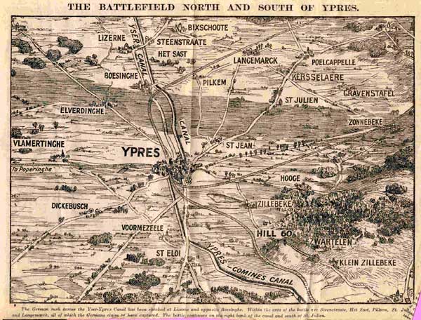 The trench lines built in the fall of 1914 between the town of Ypres, on the British side, and Menin and Roulers, on the German side—known as the Ypres salient—became the site of some of the fiercest battles of World War I, beginning in October 1914 with the so-called First Battle of Ypres. The battle, launched on October 19, was a vigorous attempt by the Germans to drive the British out of the salient altogether, thus clearing the way for the German army to access the all-important Belgian coastline with its access to the English Channel and, beyond, to the North Sea.